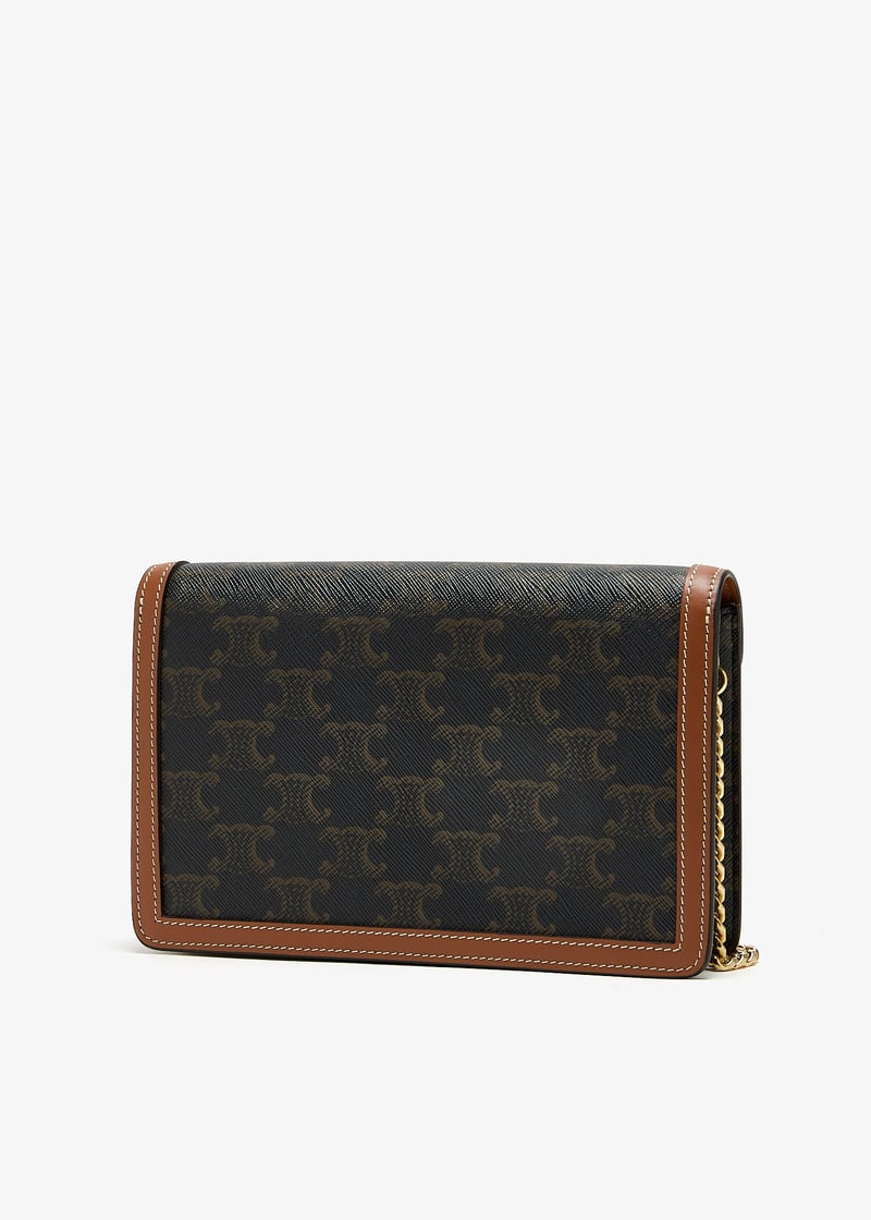 Add a touch of Parisian elegance to your wardrobe with the Triomphe Margo chain wallet. This iconic piece from Celine is crafted from coated canvas, featuring a fold-over flap closure with the Triomphe logo plaque, opening up to a compartmentalized interior with multiple card slots for easy organization. This style comes with the original dust bag. This pre-owned piece will make a great contribution towards sustainability and an even greater contribution towards your wardrobe.