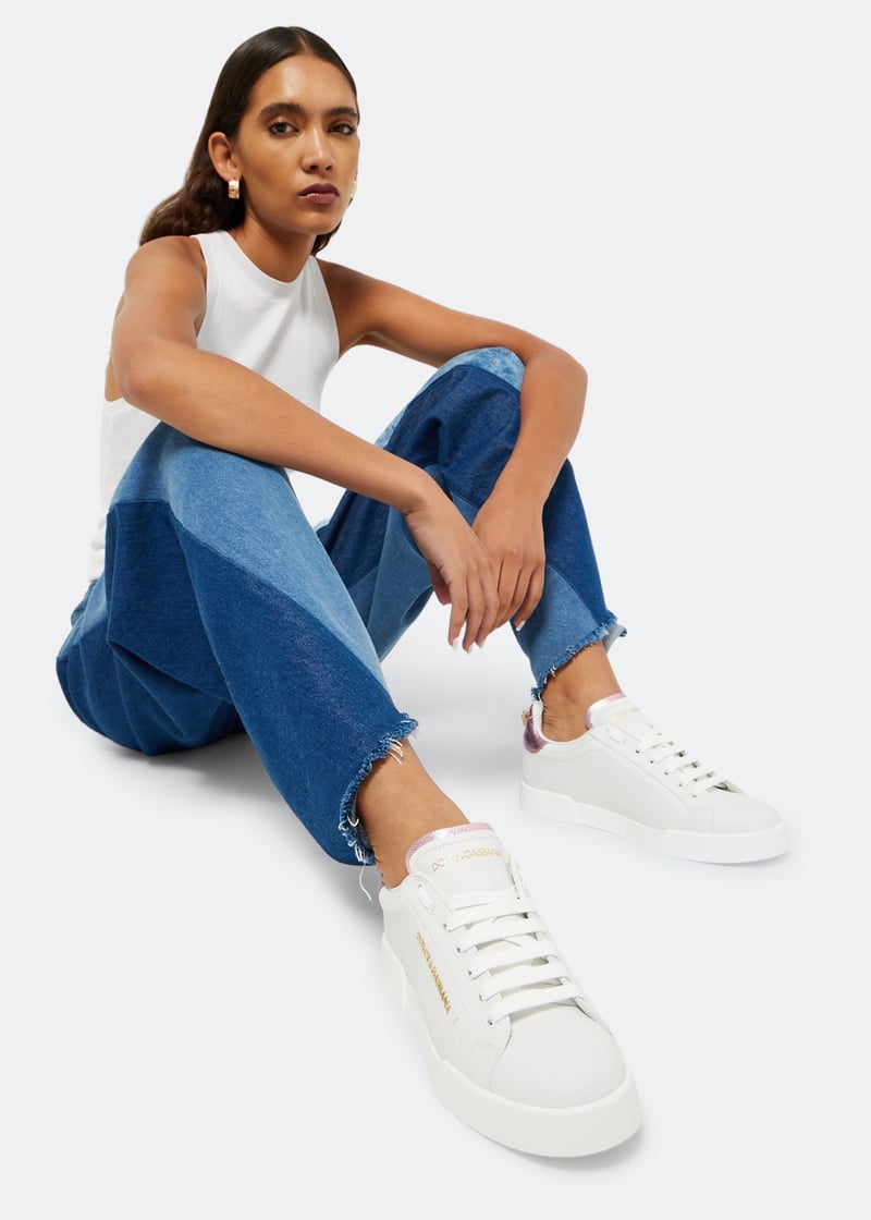 ارتقي بإطلالاتكِ في الموسم الجديد مع سنيكرز بورتوفينو من دولتشي اند غابانا. يأتي مصنوعاً من جلد النابا الفاخر بحروف شعار العلامة من المعدن المطلي باللون الذهبي الفاتح مع تصميم منخفض الرقبة، رباط مسطح، وسادة قدم من جلد العجل، نعل مطاطي متين وشريط سحب خلفي من جلد دوفين بلون متباين مزيّن بلؤلؤة تحمل شعار الدار.