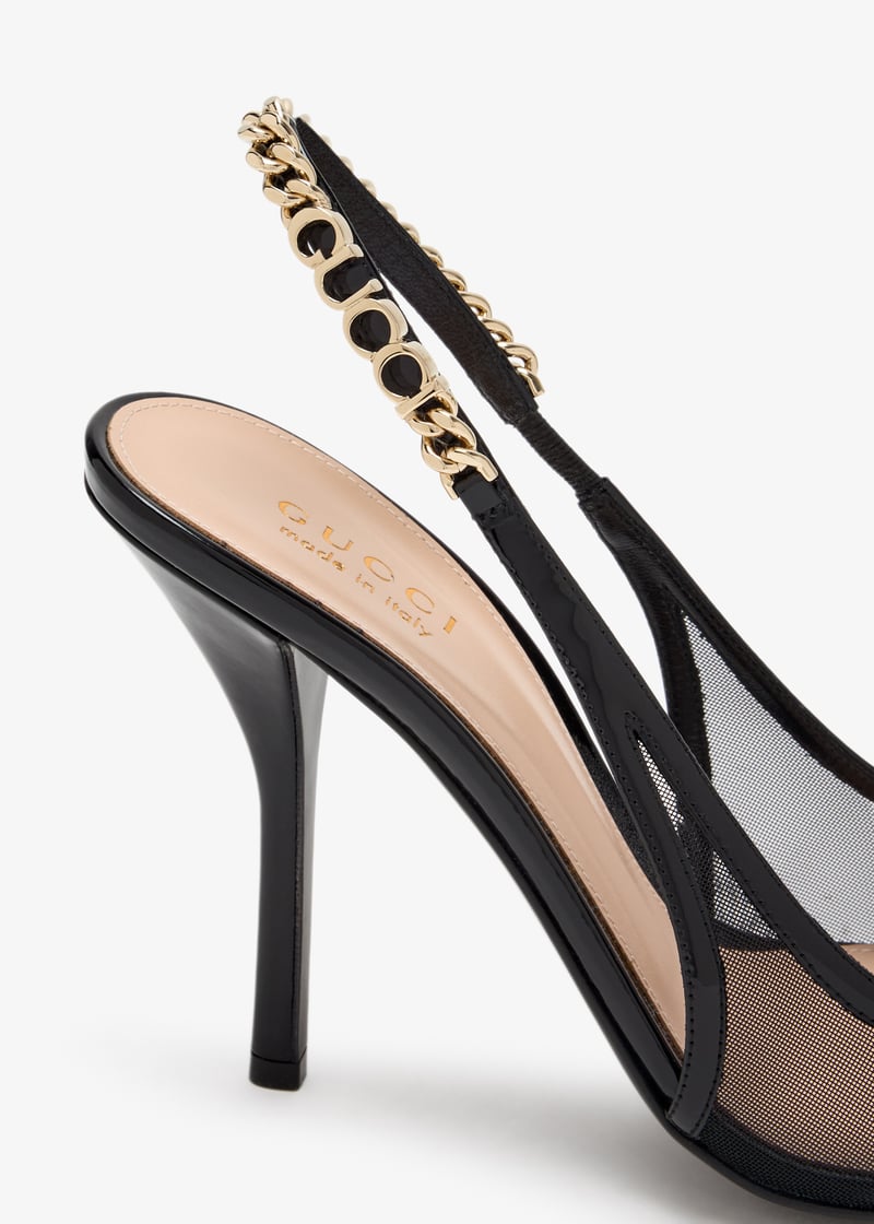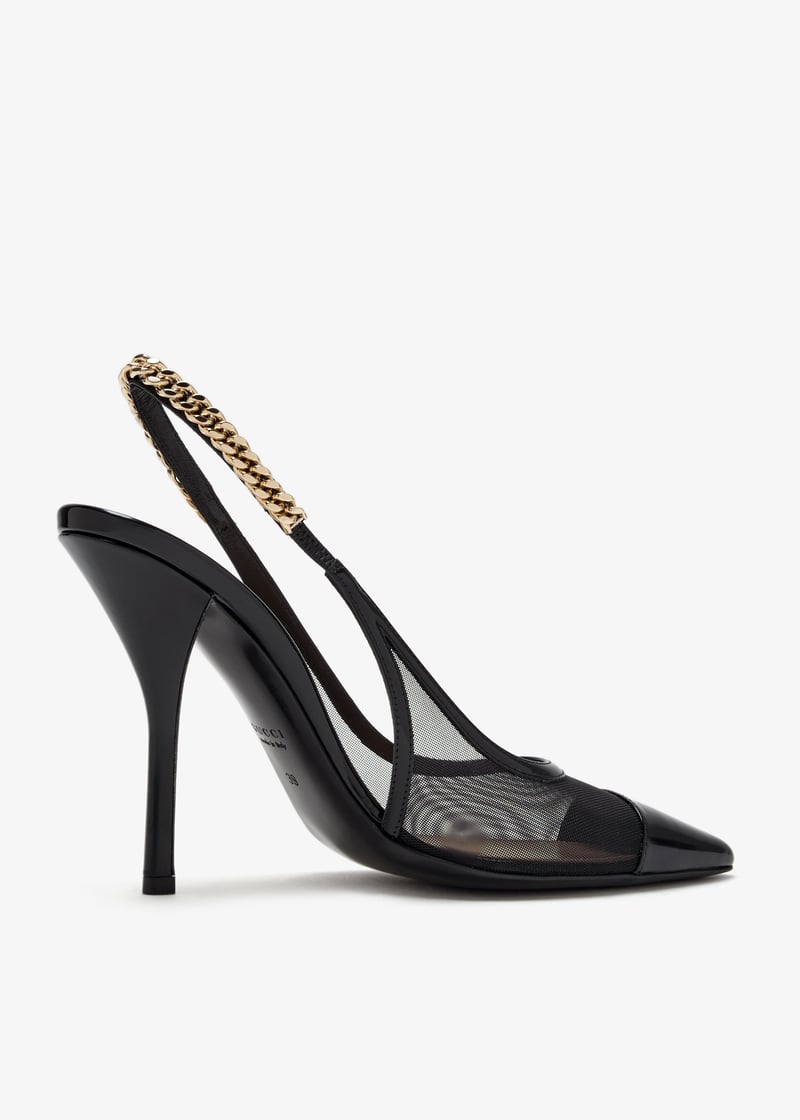 يأتي حذاء غوتشي سيجنوريا ذو الحزام الخلفي بتصميم أنيق ومعاصرمستوحى من الميدان المركزي في فلورنسا. يتميز ببنية من النسيج الشبكي والجلد بمقدمة مدببة، كعب عالي رفيع، نعل جلدي، حزام خلفي مطاطي يزدان بسلسلة غوتشي المحاكة يدوياً.