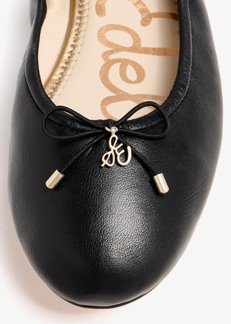 انعمي بتجربة جديدة من الأناقة والراحة مع حذاء الباليرينا فيليسيا من سام إيدلمان. مُصمم من الجلد بمظهر معدني ويتميز بنعل مبطن لمزيد من الراحة مع عُقدة صغيرة وحِلية شعار العلامة للمسة أنثوية.